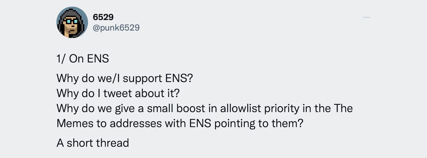 5/ Punk6529 shares why he still believes in ENS. It's like directing friends to twitter.com instead of 54.163.134.23.